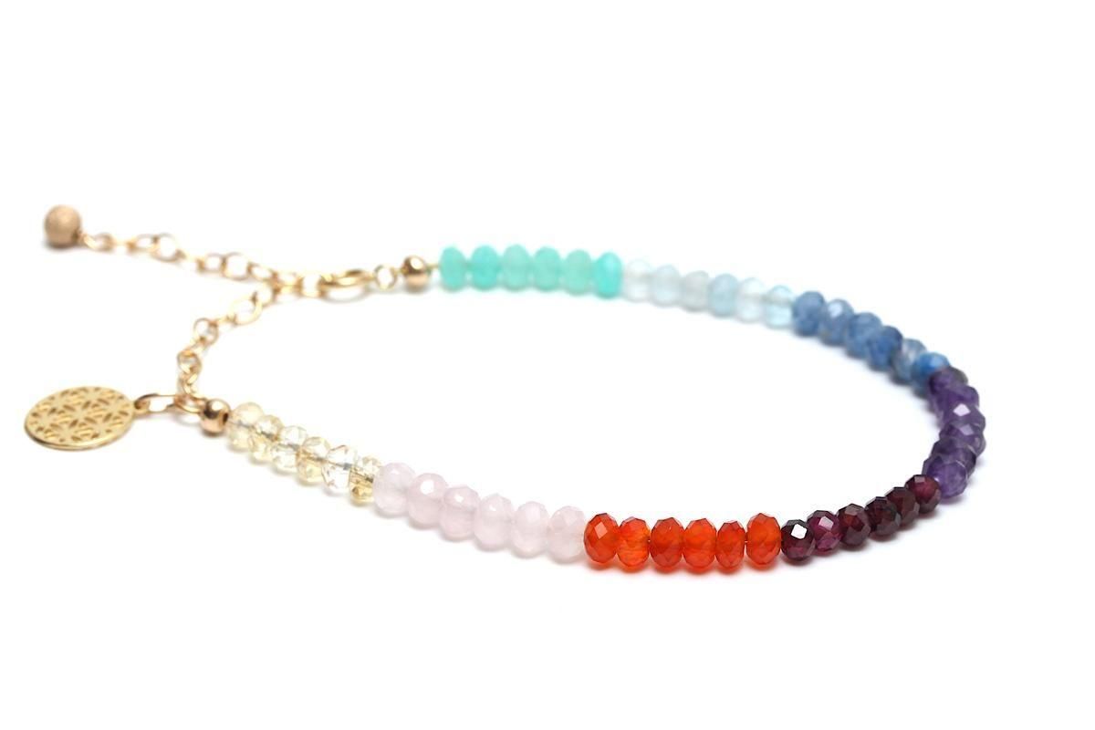 気の出入り口であるチャクラカラーに対応したストーンを1本に纏め上げる事により、全身のチャクラを刺激して体内でのエネルギーの流れを整えるブレスレットに仕上げました。